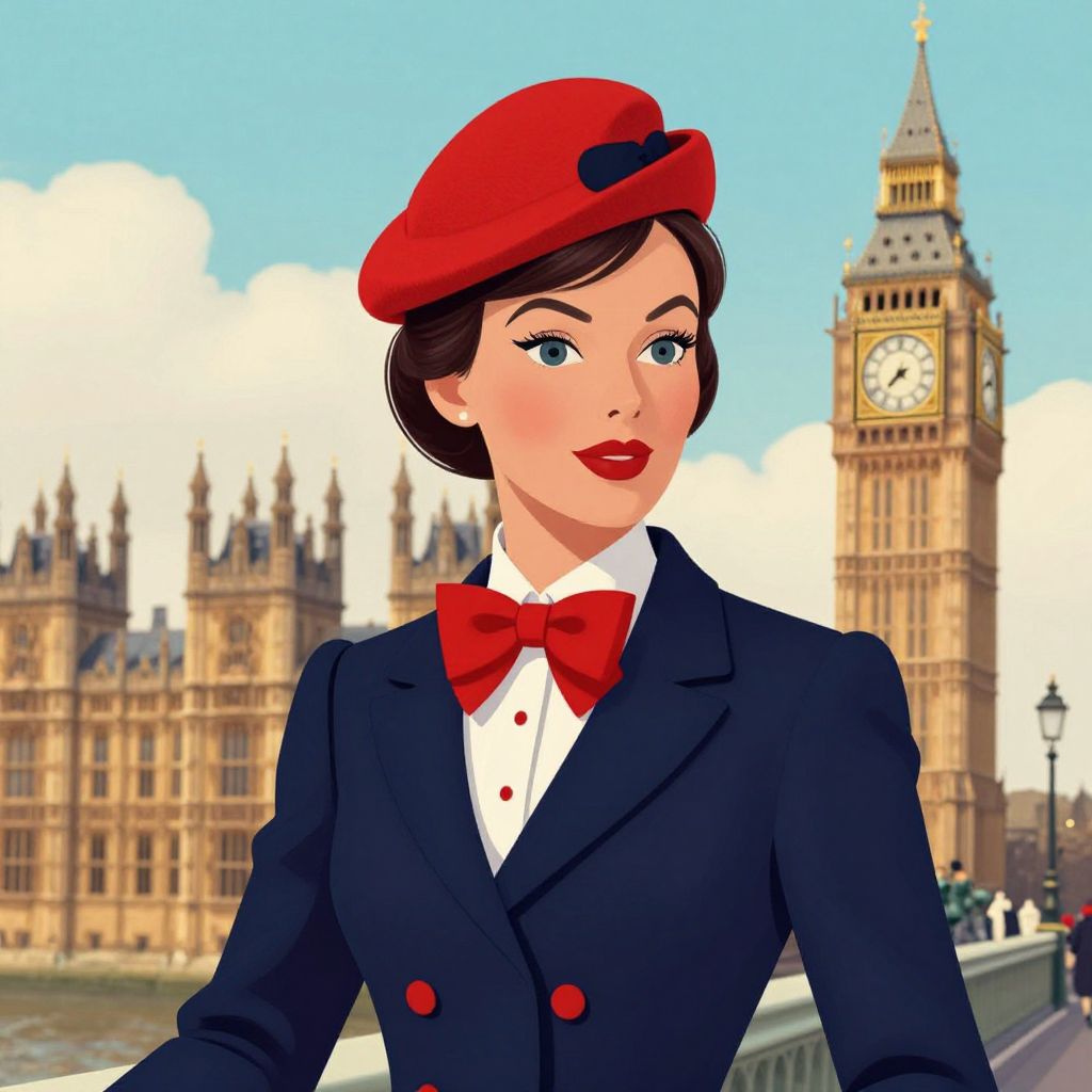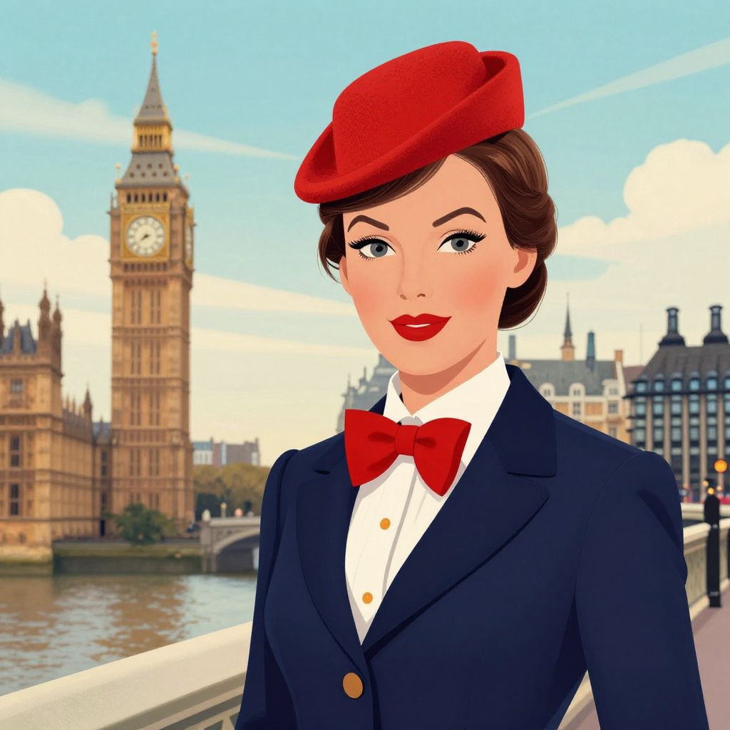 A vibrant digital illustration inspired by Mary Poppins, featuring a woman in a classic red hat and navy suit with a red bow tie, set against a nostalgic backdrop of London landmarks including Big Ben, rendered in a retro, high-definition style reminiscent of Emmanuelle Colin's artwork.