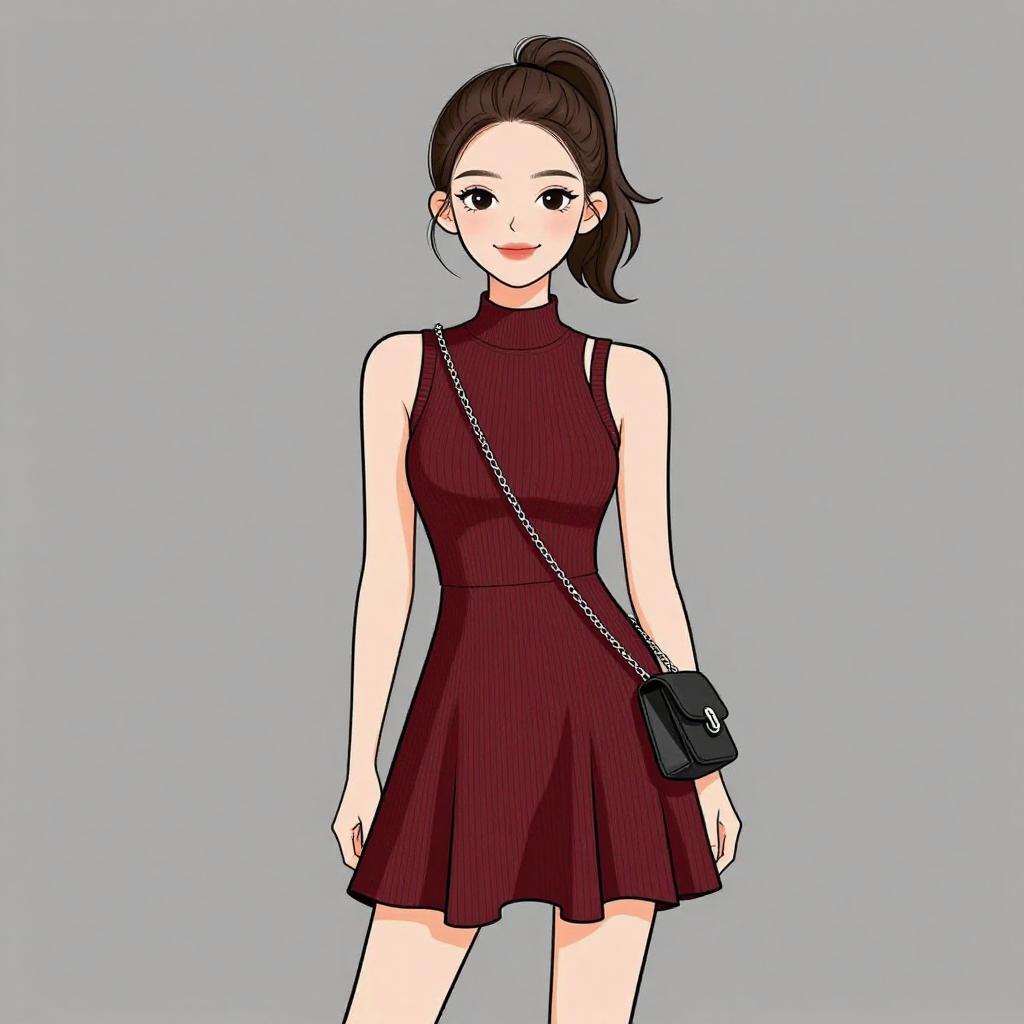 Woman with pretty face and pretty hair. smiling Woman, classic, black and white striped long-sleeve top with a high neckline, solid black mini skirt, black shoulder bag with a slim strap. --sref 1467