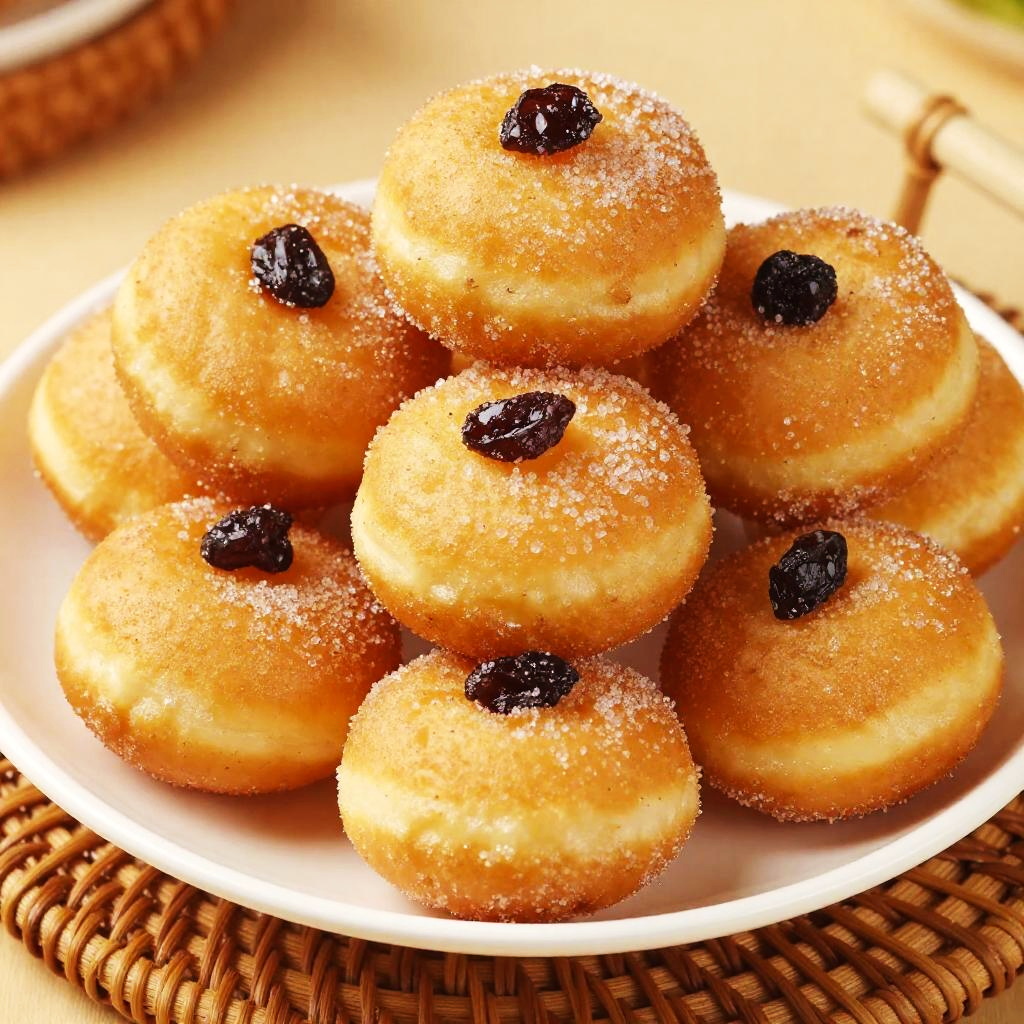 A close-up photo of a white plate filled with golden, sugar-coated doughnuts that have dark raisin chunks in the center. The doughnuts are piled high and have a slightly rough texture from the sugar coating. The plate is resting on a woven, wicker basket with a brown, textured background. The image has a warm, inviting feel.