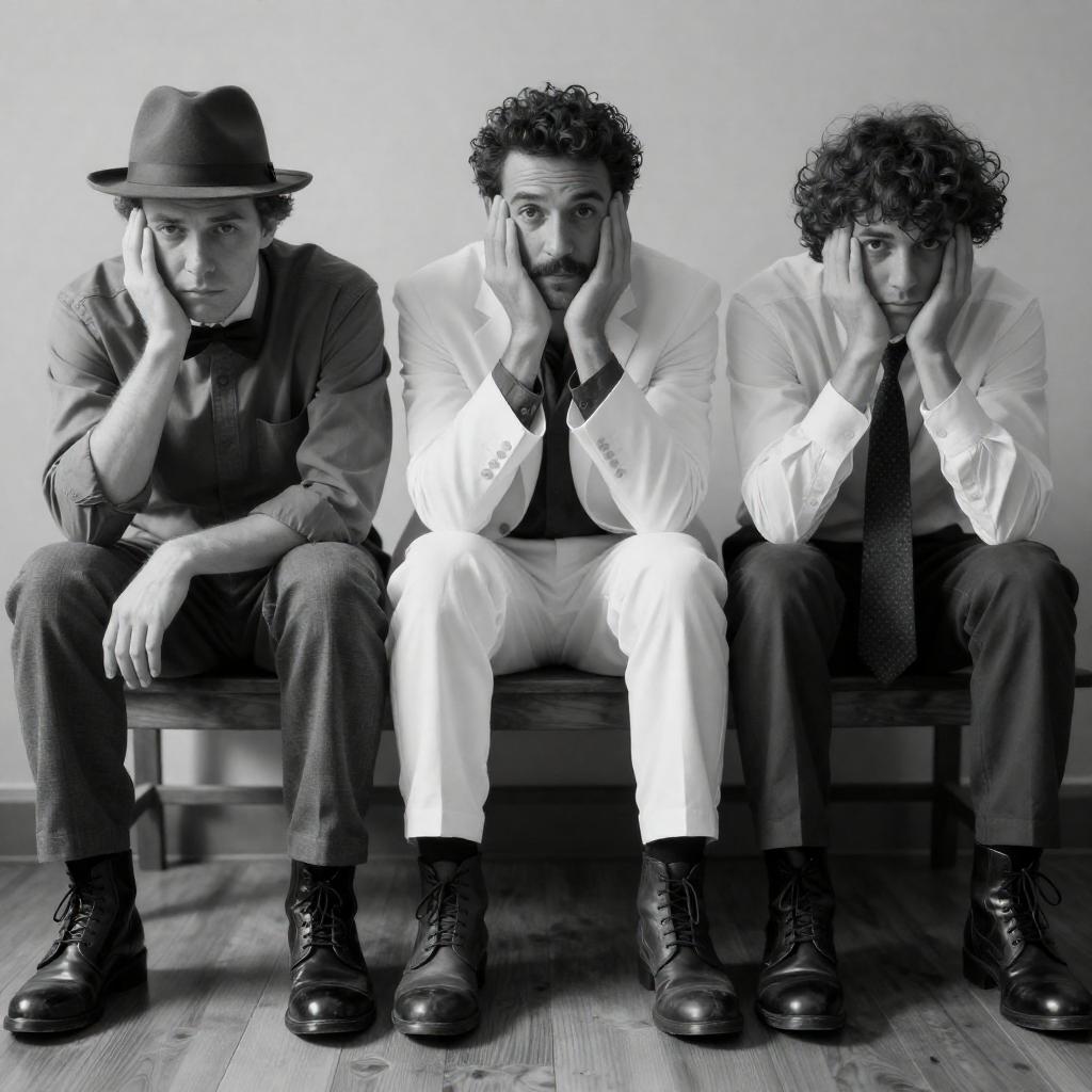 Black and white photograph of two men sitting at a round table in a dimly lit room. Both men are smoking cigars, holding them up to their mouths. The man on the left has curly hair, a beard, and wears a vest over a shirt. The man on the right has short, curly hair, a mustache, and wears a shirt. The table has several items including glasses and a bottle. Wall-mounted lights illuminate the scene. The background is dark with faint reflections.