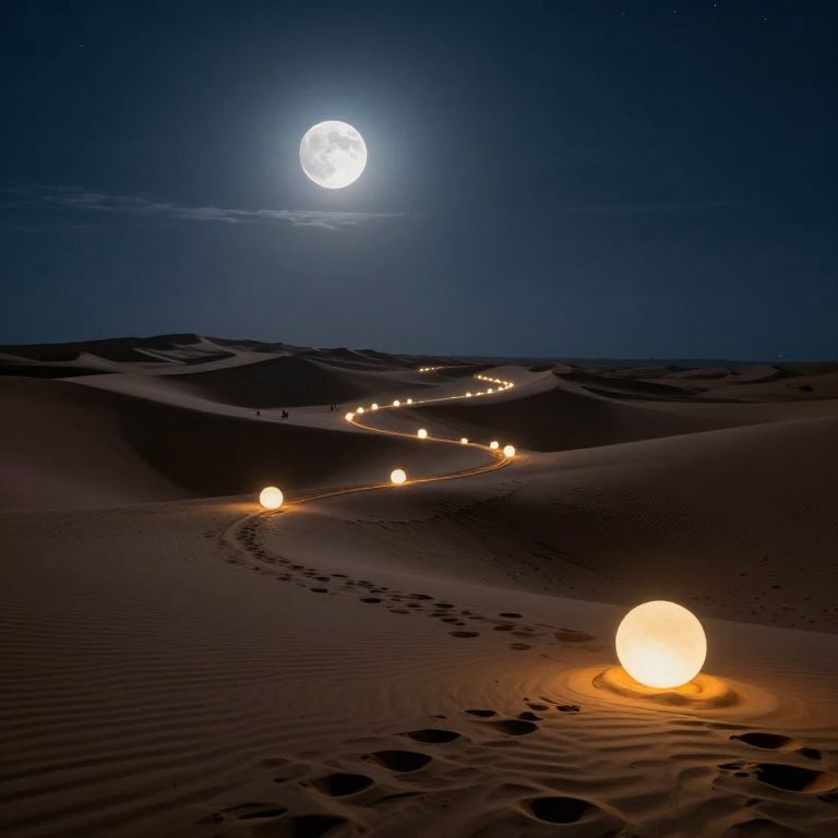 Glowing orbs trace a winding path across a vast desert landscape, illuminating the sandy dunes beneath a luminous, partially shadowed moon that dominates the star-studded night sky.