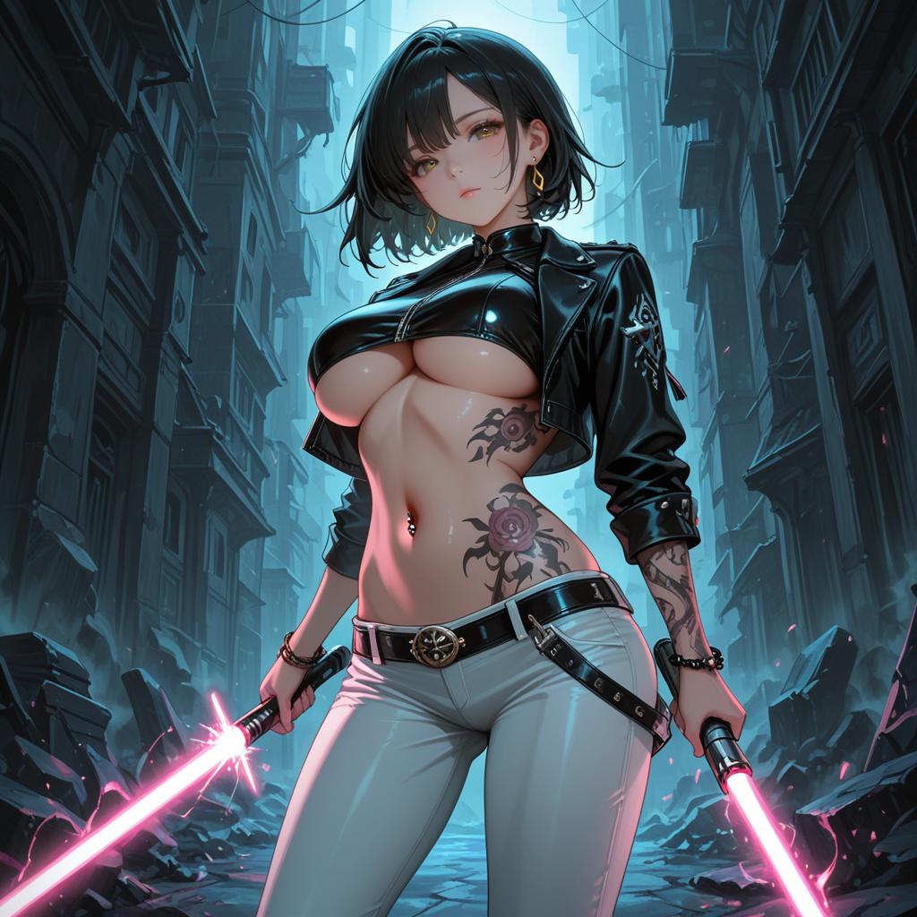 Digital artwork of a young woman standing confidently in a narrow urban alley. She has short black hair and yellow eyes, adorned with gold geometric earrings and a navel piercing. Wearing a cropped black leather jacket over a revealing top, exposing an underboob and floral tattoos on her side and arm. She holds two glowing pink energy swords in each hand and wears tight white pants with a black belt. The background features a dystopian cityscape with tall, dark buildings.