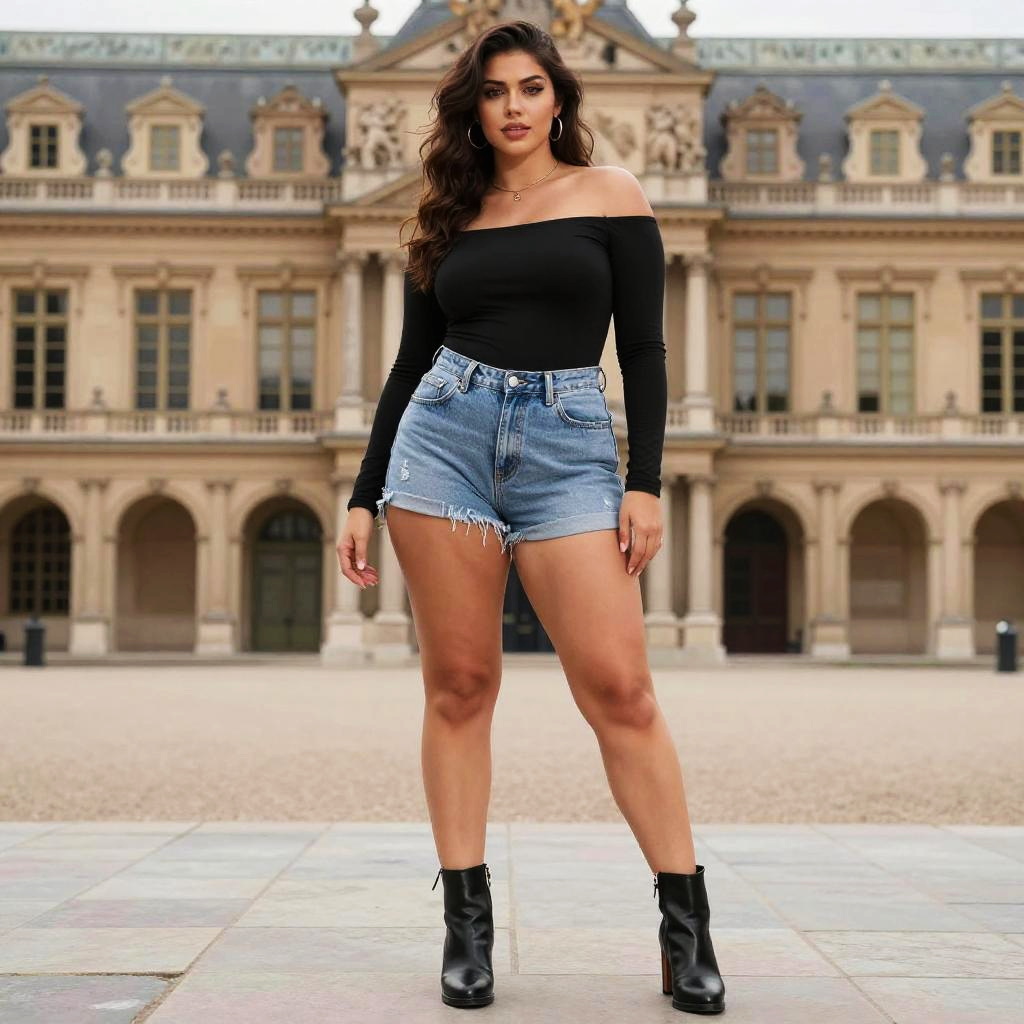 A curvy woman in a studio pierrot style, wearing a black off-the-shoulder top and light-wash high-waisted denim shorts, stands by a historic palace, black ankle boots with a slight heel completing her casual street look. Sexy. Pretty face and beutiful eyes