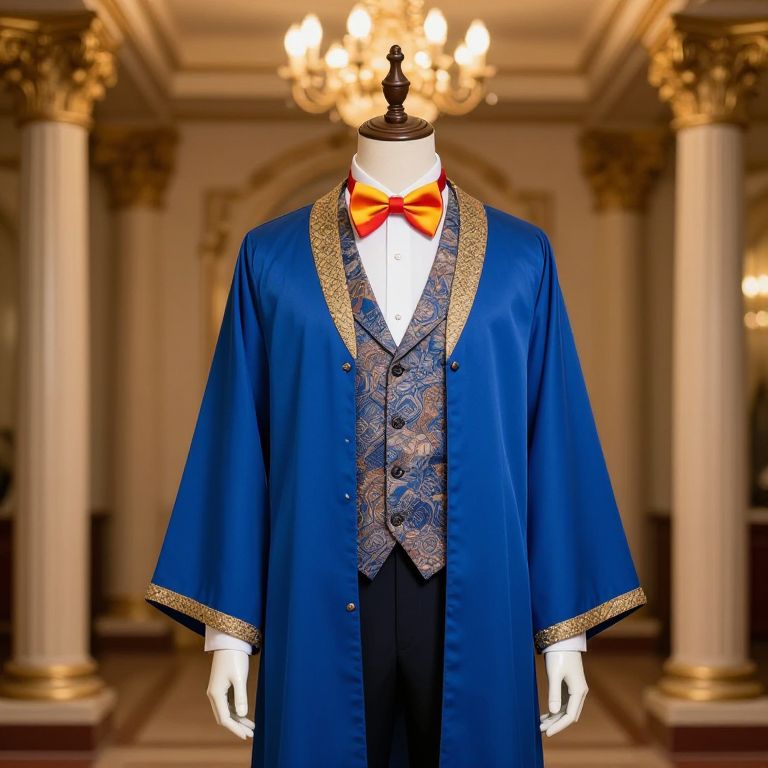 Mannequin wearing a blue robe with gold embroidery and a crown on his head. The person is holding a gold shield with a gold emblem on it. The background is a building with ornate decorations and a potted plant.
