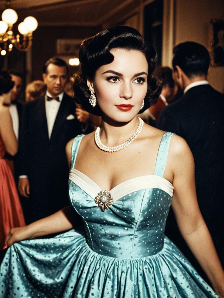 Woman in Retro Party Dress, cinematic realism, glamorous vintage portrait