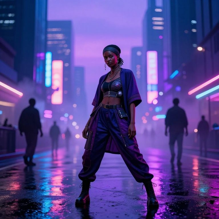 This is a digital CGI portrait of a bald, androgynous person with smooth, light skin and prominent cheekbones, standing in a neon-lit urban street at night. The subject has dark, almond-shaped eyes and a nose piercing. They are wearing a black top. The background features a wet, reflective street with colorful neon signs in pink, blue, and white, and blurred pedestrians. The image has a hyper-realistic, cyberpunk style, with detailed textures and vibrant lighting, emphasizing the futuristic and urban atmosphere.