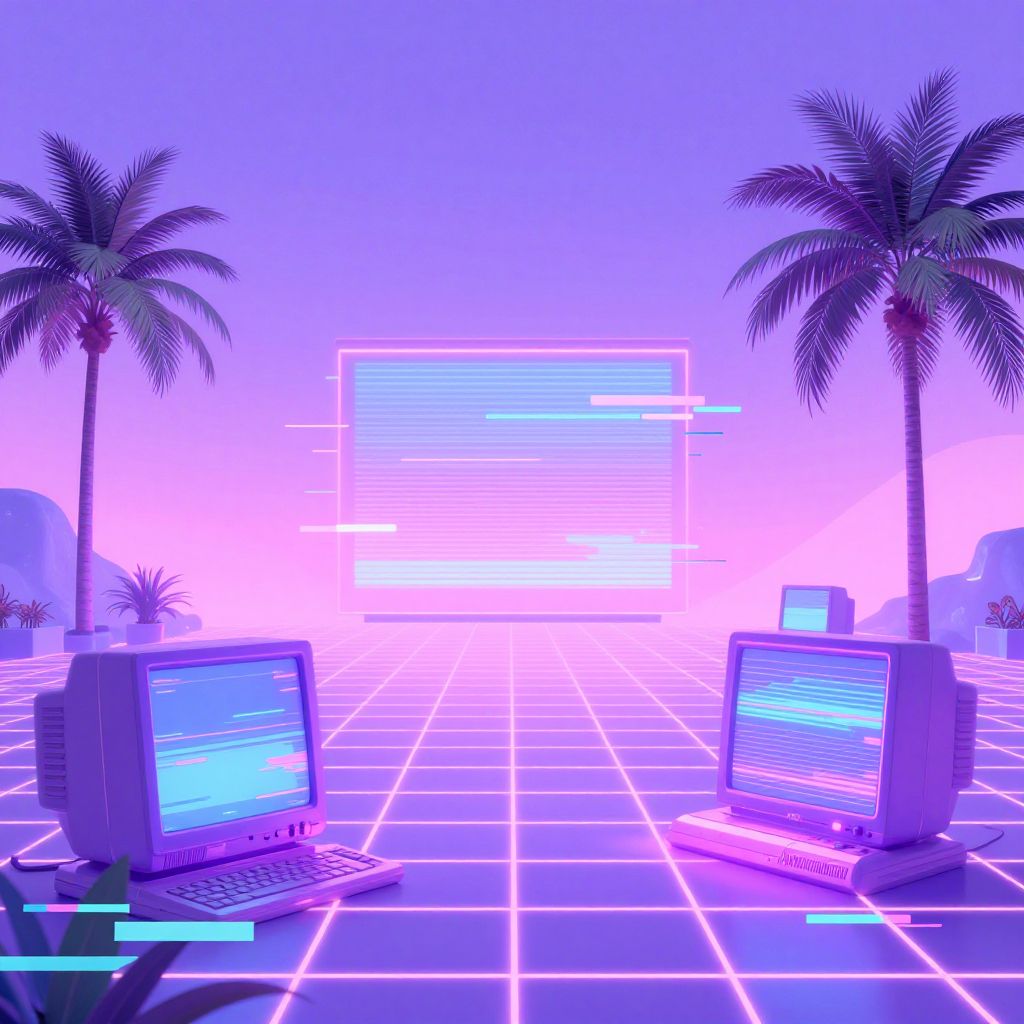 Vaporwave art generator creating surreal pastel landscapes with neon grids, retro computer elements, palm trees, and glitch effects in a dreamy 80s digital aesthetic, blending synthwave and cyberpunk visuals with soft purple and pink hues.