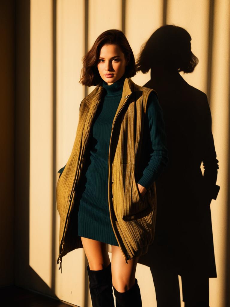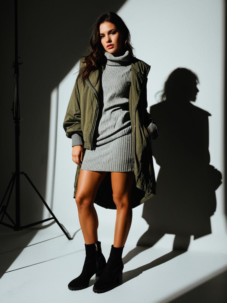 Woman, urban casual, sleeveless knit turtleneck dress in light grey, ribbed texture, mid-thigh length, oversized olive green bomber jacket draped over arms, ruched sleeves, zipper details, black ankle boots with a slight heel, simple hairstyle, standing pose, plain studio background --sref 1404