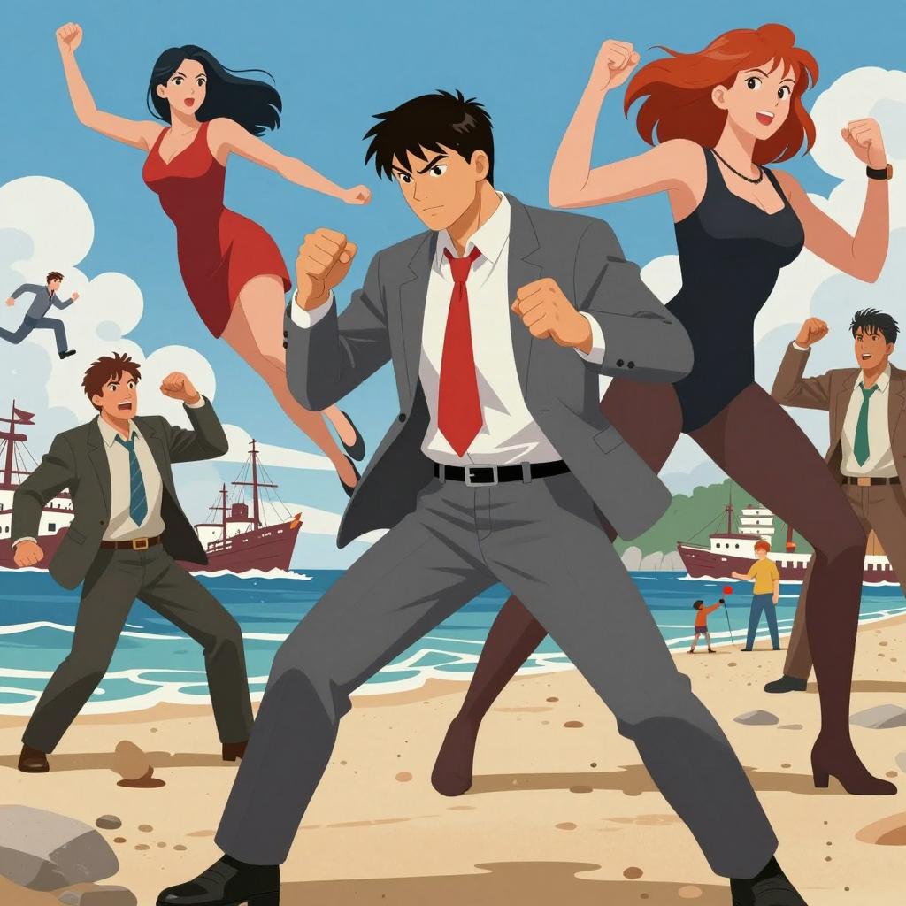 Illustration of an action scene with a central man in a gray suit, red tie, and clenched fists, fighting. A woman in a red dress hangs in the upper left. Background includes falling men, a woman with red hair in the top right, ships at sea, and people on a beach. Multiple characters in various intense actions. Vivid colors, dynamic poses.