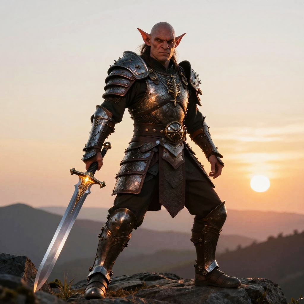 Handsome goblin warrior posed heroically on rocky terrain at sunset, intricate armor plates, glowing sword in hand, cinematic lighting and dynamic composition