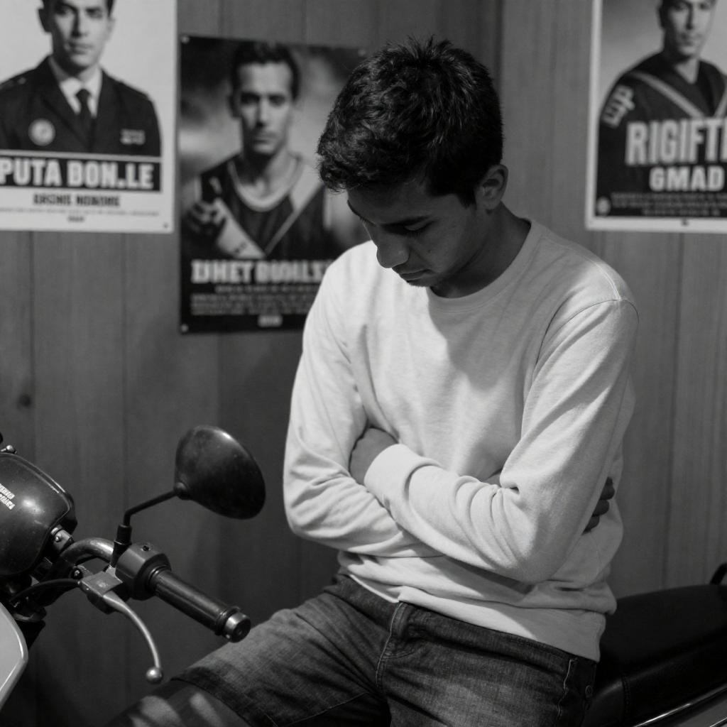 Black-and-white photograph of a young man with short dark hair, sitting with crossed arms, looking down, wearing a long-sleeve shirt and shorts, next to a motorcycle in a cluttered room. Background includes various posters and a wooden wall.