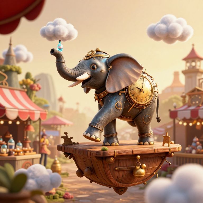 In a whimsical 3D-rendered fantasy world, a majestic clockwork elephant balances gracefully on a wooden platform, traversing a floating marketplace adorned with vibrant red awnings and golden-hour lighting, while dispensing dream-filled bottles of bottled clouds that evoke forgotten memories.