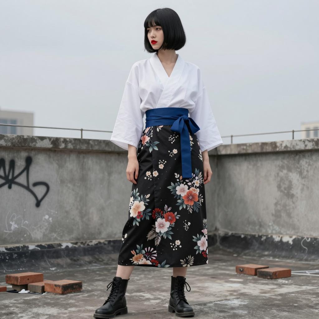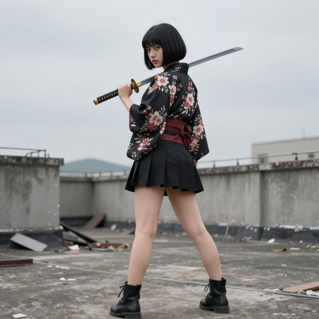 Asian woman with short black bob haircut, pale skin, standing on rooftop. Wearing white blouse, black floral kimono-style dress, blue obi sash, black combat boots. Background: weathered concrete wall with graffiti, overcast sky, scattered bricks. Blade in obi sash. Facing left, slightly turned, red lipstick, intense expression.