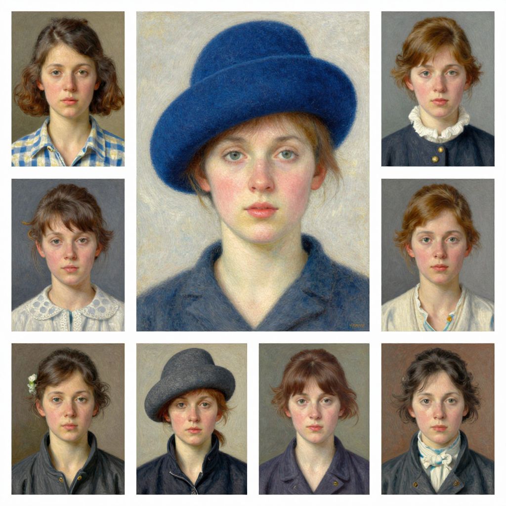 This image is a digitally collaged photograph of nine headshots of a young Caucasian woman with fair skin and brown hair, styled in various ways. She wears different outfits and hats, including a blue felt hat, a brown straw hat with a wide brim, and a dark jacket with a white shirt. Her expressions are neutral to slightly serious, and the background of each headshot is a plain, gradient gray. The central headshot is brightest, with a white background, while the others have darker, textured backgrounds. The image showcases her varied appearances and hairstyles.