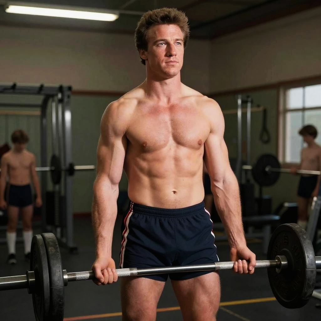 Arnold Schwarzenegger teen, vintage 1970s high school gym setting, muscular young athlete lifting weights, dramatic lighting, photorealistic style