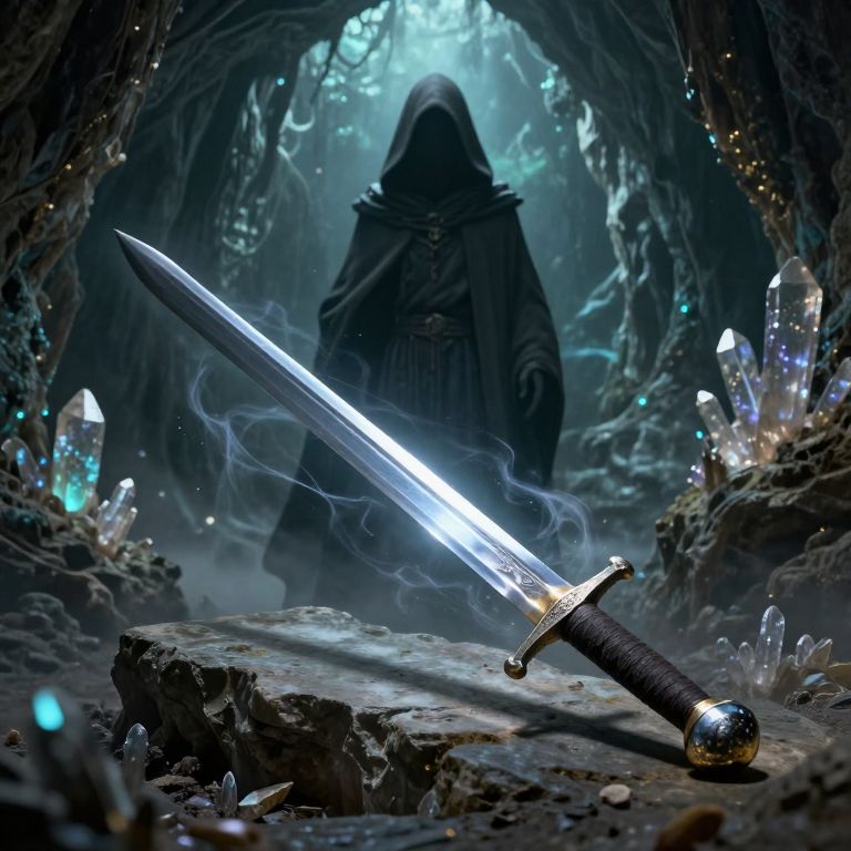 Digital fantasy artwork depicts a dark, cavernous setting illuminated by glowing crystals. A hooded, shadowy figure stands in the background, shrouded in mystery. In the foreground, a gleaming, silver sword with a black hilt and gold accents rests on a rocky surface, emitting electric blue sparks. The cave's walls are rough and textured, adorned with bioluminescent crystals that add a mystical ambiance. The sword's light contrasts sharply with the dark surroundings, highlighting the mystical and ominous atmosphere of the scene.