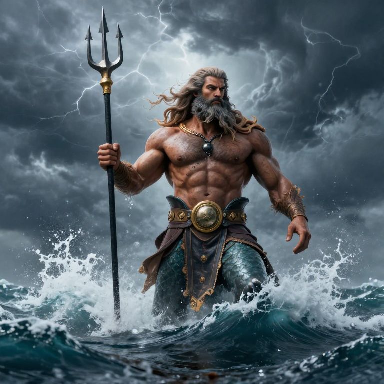 Digital artwork of a muscular, bearded Poseidon-like sea god with long hair, holding a trident, standing in turbulent ocean waves, lightning illumin