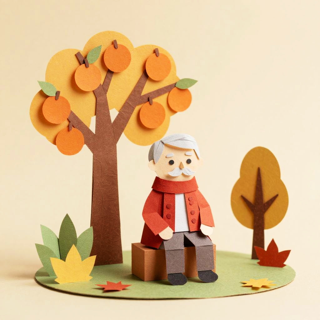 A paper craft styled sculpture of an elderly man with silver hair and mustache, wearing a red coat and scarf, sitting beside a tree with orange fruits. The scene is filled with autumn colors including warm orange, yellow, red, and green tones, detailed paper texture, handcrafted appearance, cozy and rustic atmosphere