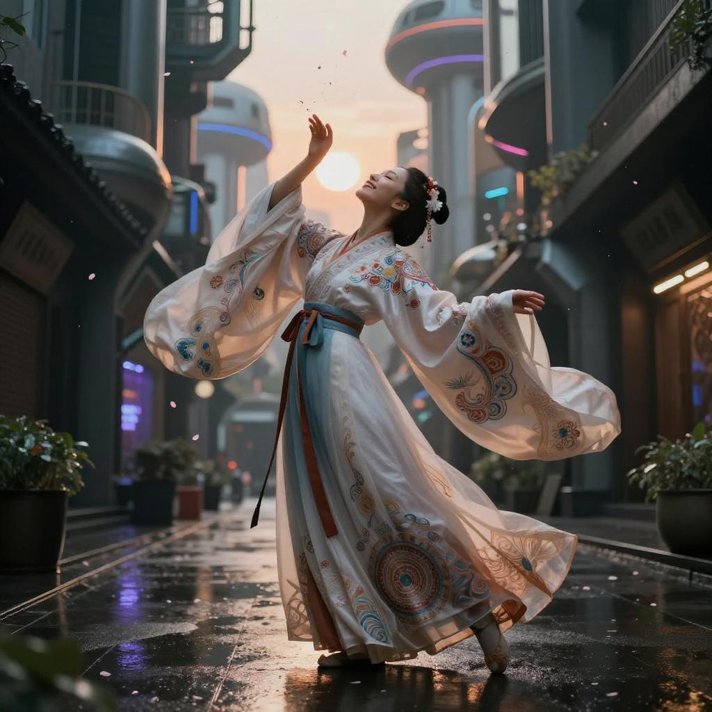 Best quality, masterpiece, ultra high res, raw photo, beautiful and aesthetic, deep shadow, dark theme, (photorealistic:1.4), elegant crane, wearing flowing Hanfu with embroidered silk sleeves, soft smile, open mouth, closed eyes, ((chiaroscuro, backlight, sunset, petals floating)), graceful poise, evocative atmosphere, magnetic presence, captivating mystique, intricate zentangle patterns, astonishing level of detail, striking perspective, a chaotic masterpiece balanced by harmony, vibrant color palette, ((outdoors)), rain-soaked alley with neon haze, inspired by futurist architecture