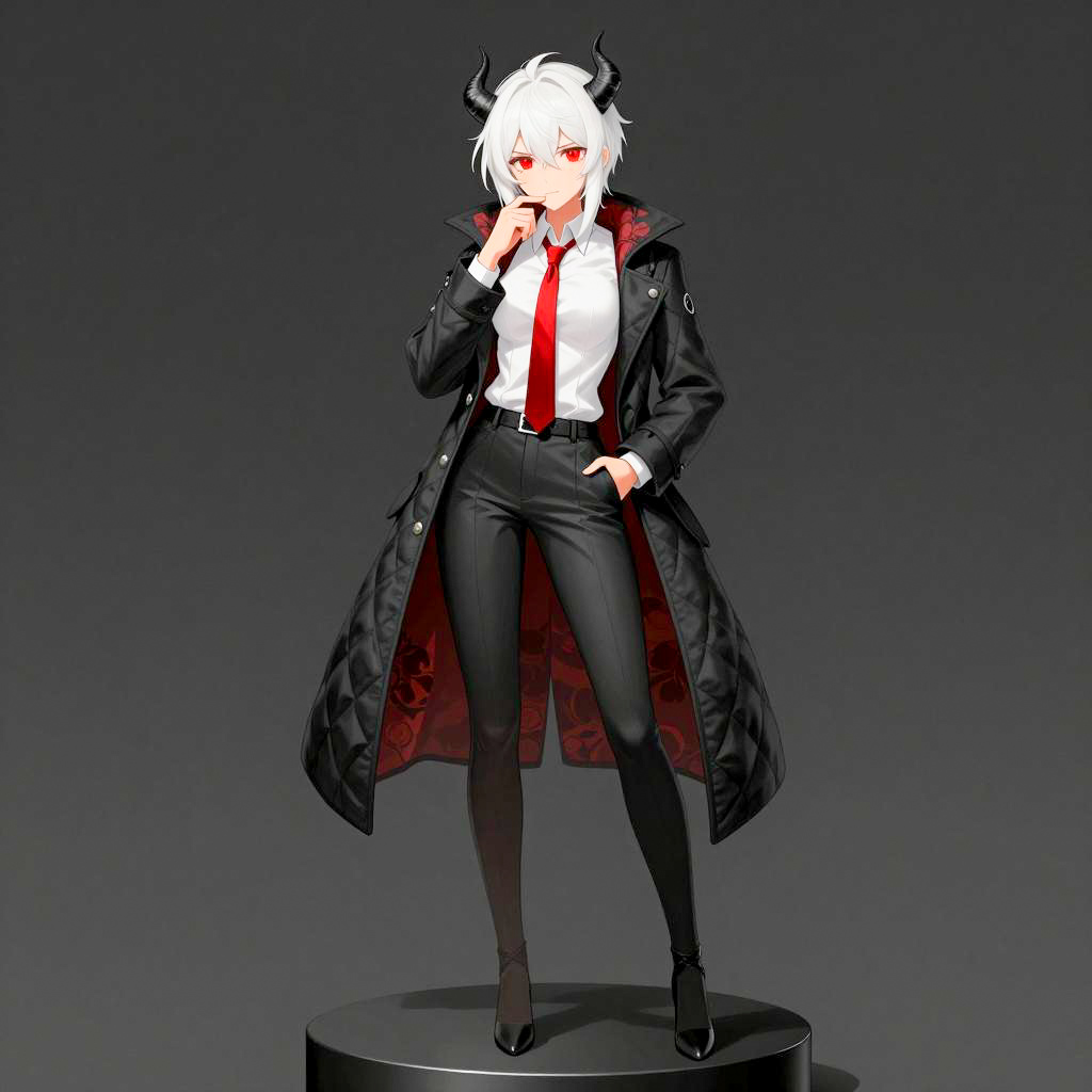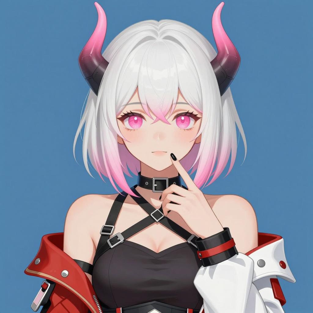 Digital illustration of a female character with white bob-cut hair, pink horns, and large pink eyes. She wears a black strappy top, a red and white jacket, and a black collar with a buckle. She has pink-tinted hair tips, black fingernails, and a neutral expression. The background is solid blue. Her right hand is raised to her face, touching her chin.