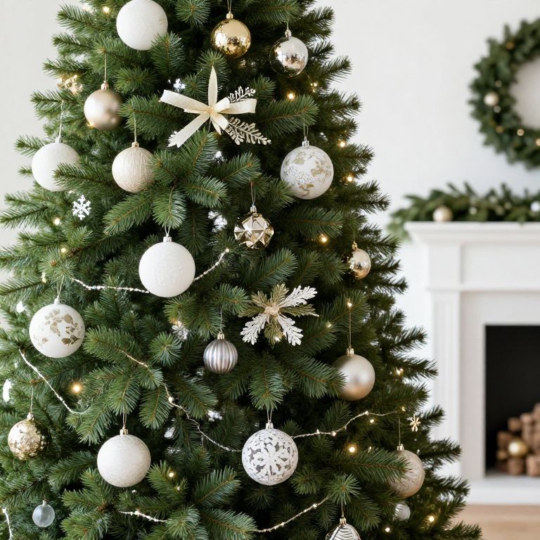 Photograph of a decorated Christmas tree with dark green needles, adorned with white and gold spherical ornaments, white snowflake and star-shaped decorations, and small white lights. The background shows a white fireplace with a blurred green garland and a wooden log inside. The tree occupies the left side of the image, with the fireplace on the right. The overall color scheme is festive and elegant, with a focus on white and gold against the green tree.