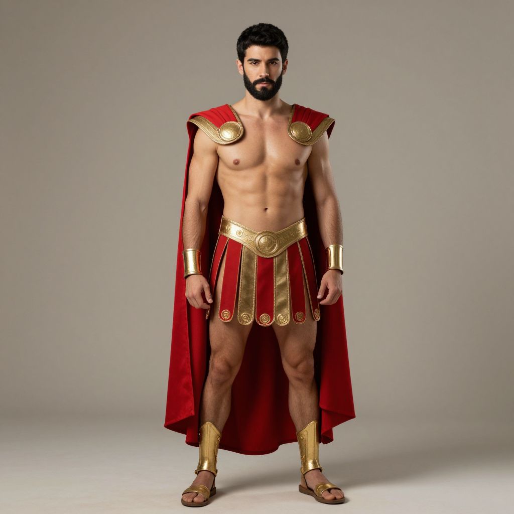 Photograph of a muscular, dark-haired, bearded man standing confidently in ancient Roman attire. He wears a red cape, gold shoulder armor, and a red and gold pleated skirt with a gold belt. His arms are adorned with gold cuffs, and he wears brown sandals. The background is a plain, light grey studio setting, highlighting his well-defined physique and serious expression. The lighting is even, emphasizing the texture of the fabric and metal. The overall style is realistic with a focus on historical costume.
