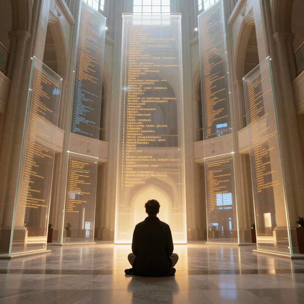 Silhouetted person sitting cross-legged in grand, illuminated cathedral hall, surrounded by tall, glowing, text-filled glass panels. Photorealistic photograph