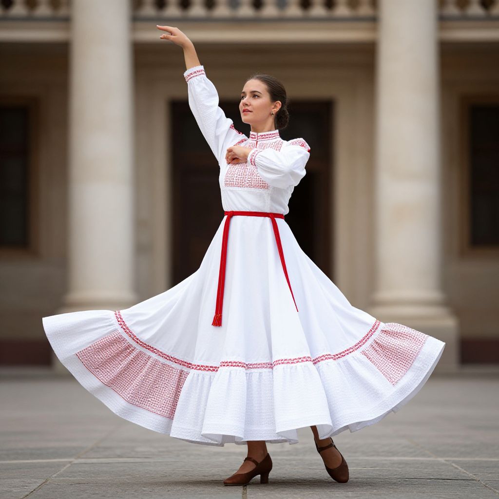 Tiklos Folk Dance Costume, woman in a white dress standing in front of a building