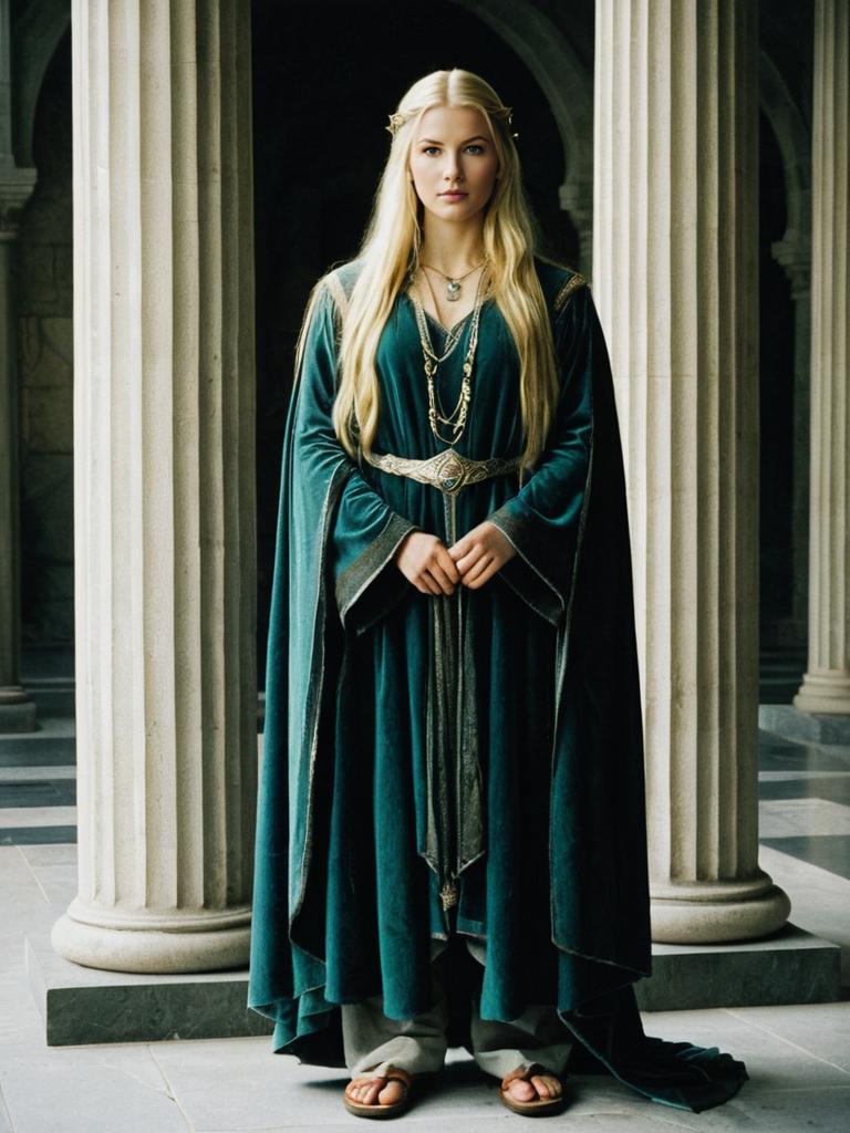 Lord rings costume arwen, long hair, necklace, standing, jewelry, robe, blonde hair, pillar, sandals, 1boy, full body, looking at viewer, male focus, solo, 1girl, closed mouth, column