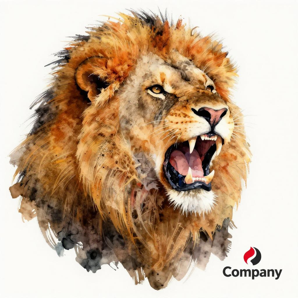 A vibrant watercolor painting of a courageous lion roaring fiercely. The stylized artwork captures the lion's intense expression, detailed mane with shades of orange, yellow, and black, and sharp teeth. The composition emphasizes themes of courage and strength. Company branding is visible in the lower right corner.