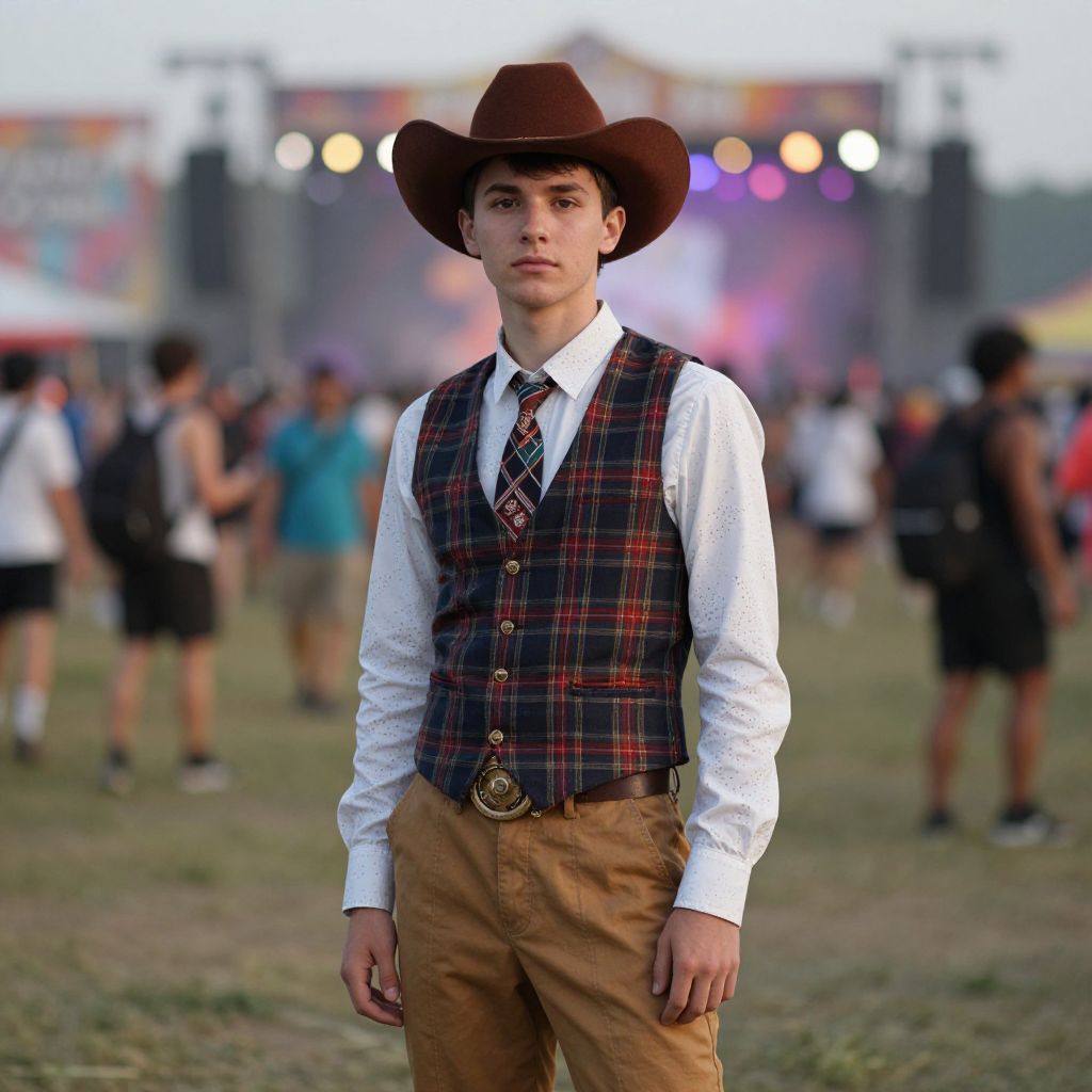 Beyond wonderland rave, 1boy, male focus, solo, hat, pants, looking at viewer, blurry background, vest, outdoors, plaid, blurry, long sleeves, cowboy shot