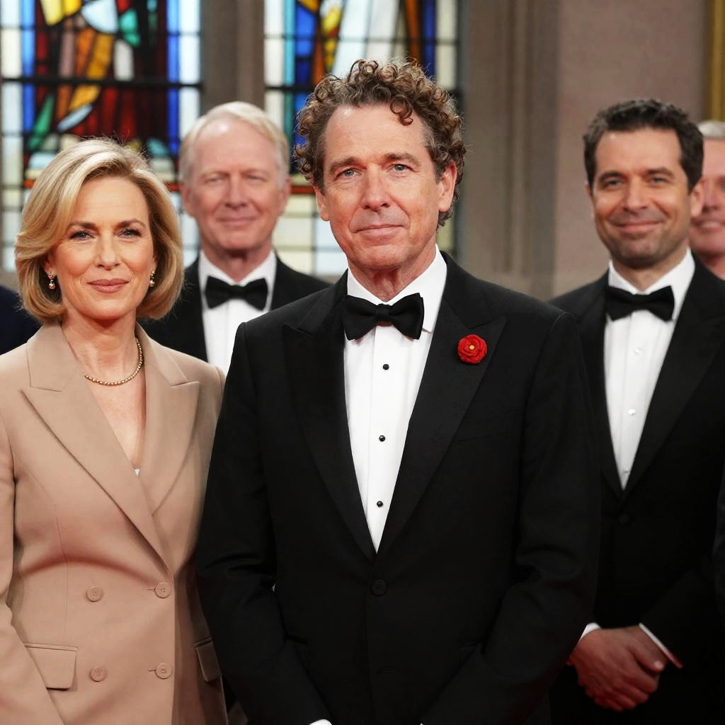 Photograph of a formal event. A middle-aged man with curly hair, wearing a black tuxedo with a red flower boutonniere, stands in the foreground. To his left, a woman with short blonde hair in a tan blazer smiles. Two other men in the background, one with blonde hair and the other with dark hair, smile. Stained glass windows in the background. The man in the tuxedo has a neutral expression.