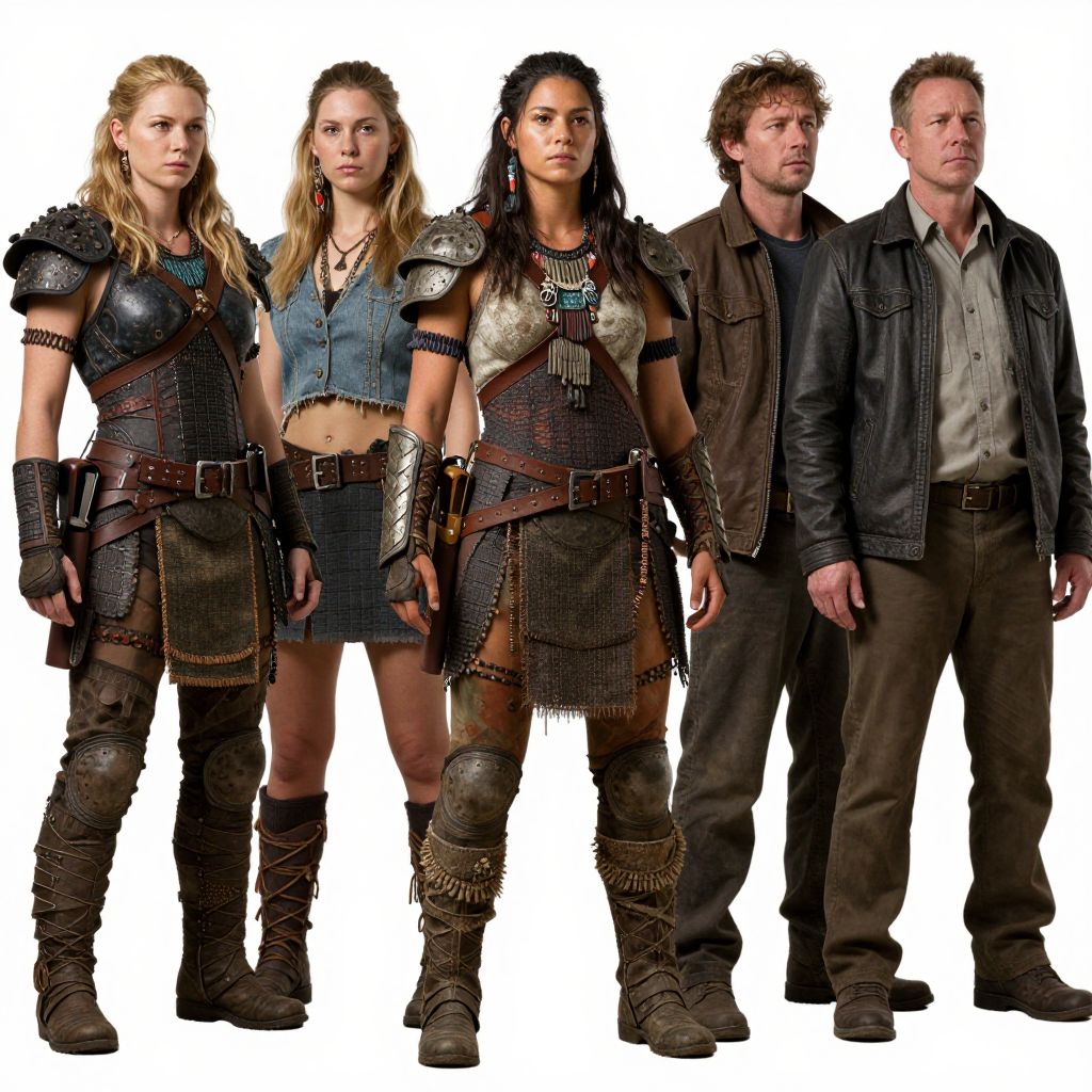 Photograph of five individuals standing in a line against a white background. Four women with varying blonde hair lengths wear medieval-style armor with leather and metal accents, including shoulder pads, arm guards, and chain skirts. The woman on the far left has wavy hair, while the others have straight or curly hair. The man on the right wears dark, rugged clothing, including a leather jacket and buttoned shirt. All stand with serious expressions, displaying a mixture of strength and determination. The image has a high-contrast, dramatic lighting style.