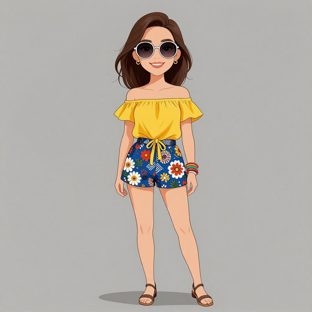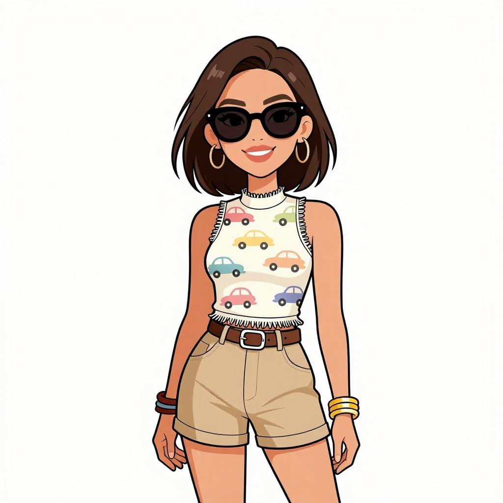 Woman with pretty face and pretty hair. smiling Woman, casual, sleeveless printed top with high neckline, pastel car pattern, fringed hem, paired with tailored khaki shorts, mid-thigh length with side pockets and button detailing, accessorized with oversized sunglasses, chunky bangle bracelets, brown belt with a simple buckle. --sref 1467