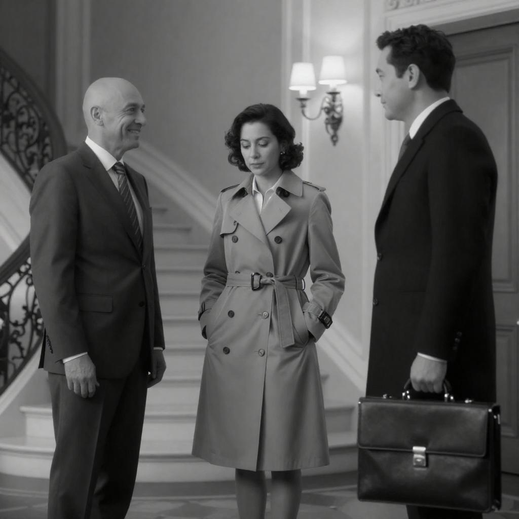 Black-and-white photograph of three people in an ornate room. A bald man in a suit stands on the left, smiling, facing a woman in a light trench coat standing in the center. A man in a dark coat stands to the right, holding a briefcase. Elegant staircase and wall sconces in the background. The woman looks down, while the other two have clear expressions.