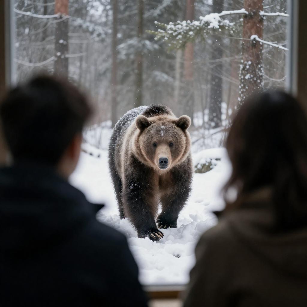 Photograph of two people with dark hair, seen from behind, watching a bear in a snowy forest through a window. Snowfall is visible. Bear is centered in the background, walking through the forest. People wear dark clothing. Intense focus on bear.