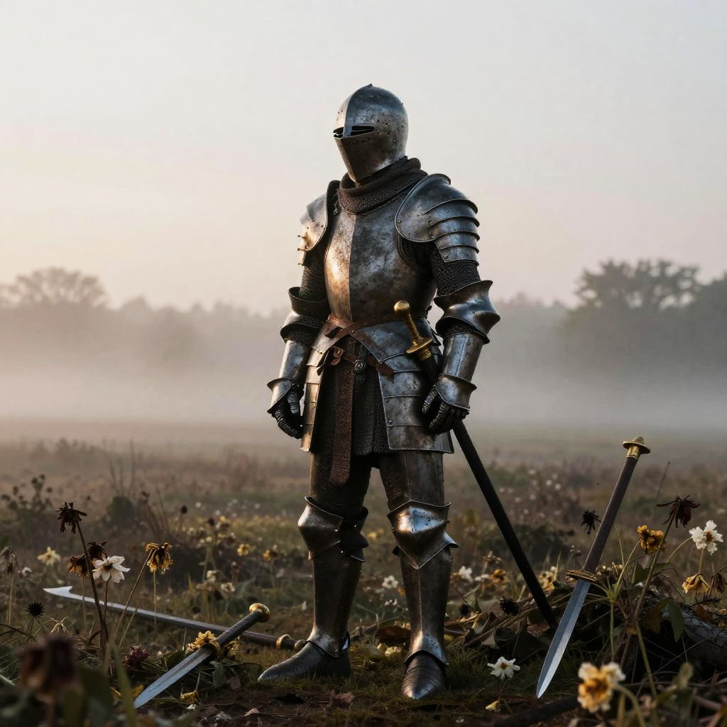 Sad knight standing alone on a misty battlefield at dawn, heavy armor tarnished and worn, his expression sorrowful as he gazes at the horizon, surrounded by wilted flowers and broken weapons, dramatic lighting enhancing the melancholic mood.