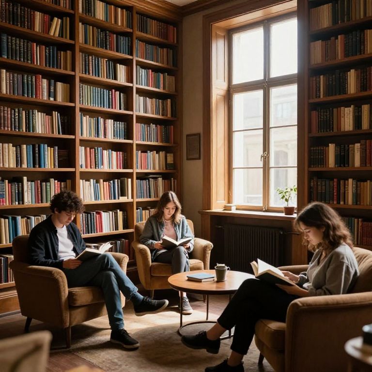 Readers sitting in a cozy library with tall wooden bookshelves, warm sunlight streaming through the windows, soft armchairs scattered around, people deeply engrossed in books, a peaceful and inviting atmosphere, rich earth tones, detailed and realistic style.