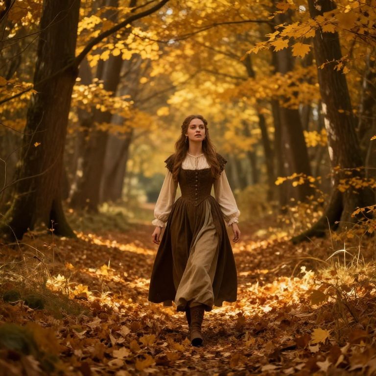 Photograph of a woman with long brown hair in a Victorian-style brown dress, walking through an autumn forest with golden leaves and sunlight filtering through trees.