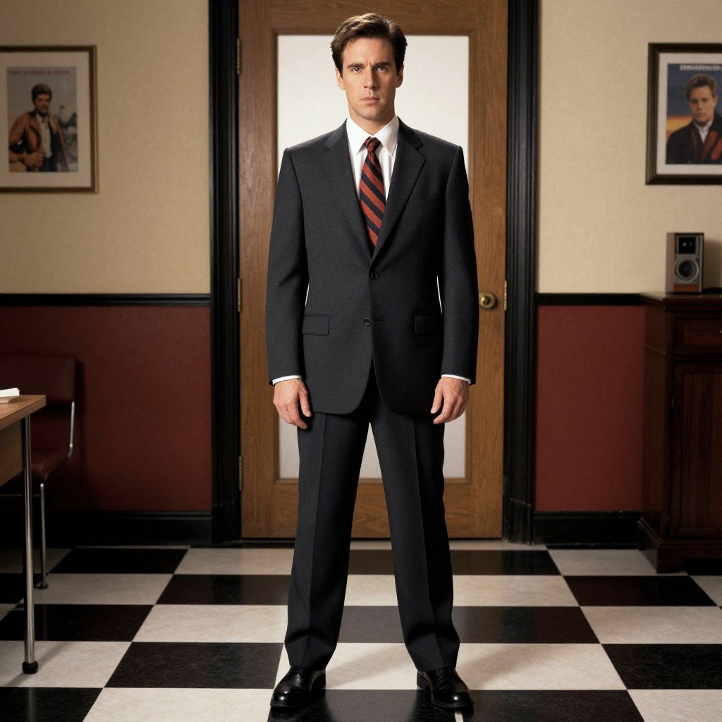 Photograph of a serious-looking man with short brown hair, standing in the center of a room with black and white checkered floors. He wears a black suit, white shirt, and red and black striped tie. The background features a wooden door with a glass panel, flanked by two framed pictures on beige walls with maroon lower panels. A wooden table with a stack of papers is on the left, and a small speaker is on the right. The lighting is bright, highlighting the man's formal attire and the room's classic, slightly vintage decor.