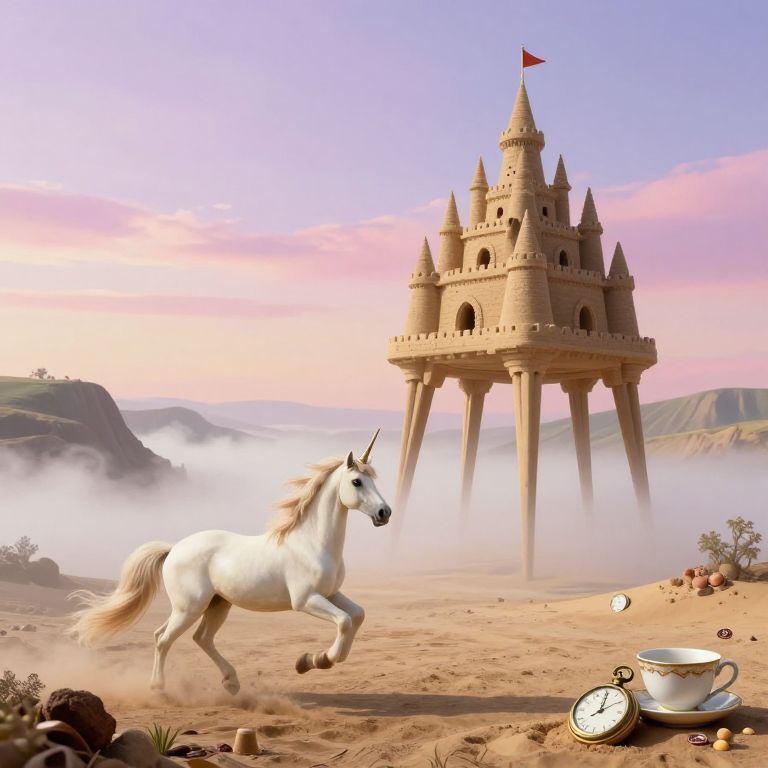 Craft an image in the surrealistic vein, depicting a fantastical scene where a regal equine creature stands atop an imposing, tower-like structure adorned with intricate machinery. The horse's ethereal form is composed entirely of undulating sand dunes, seamlessly transitioning from its sinuous muscles to the wind-sculpted peaks of the edifice. As dawn breaks in the background, a golden light bathes the scene, casting elongated shadows that both harmonize and juxtapose with the dreamlike landscape. The muted yet vivid color palette features shades of lavender, pale blue, and silver-grey, evoking feelings of mystery, serenity, and awe.