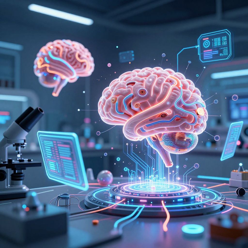 Digital CGI of glowing, neon-colored human brain floating above futuristic lab workstation with holographic screens and circuitry. Blue and pink lights illuminate the scene,