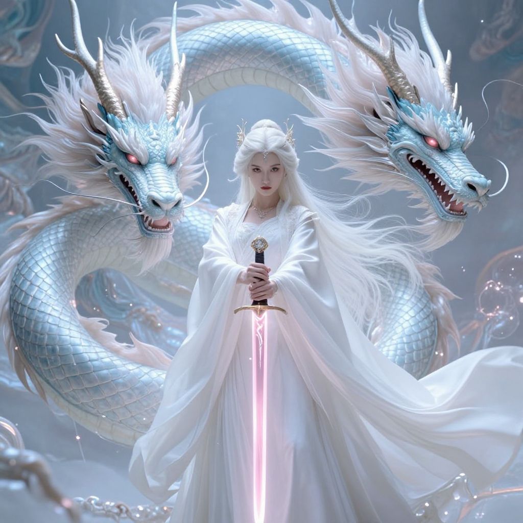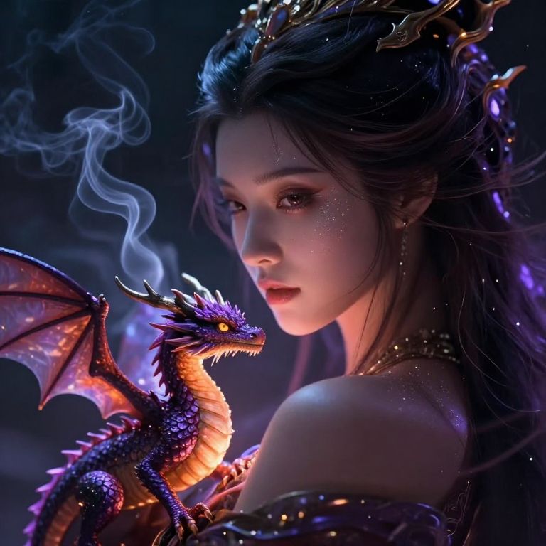 Dragon on background, (mysterious:1.3), ultra-realistic mix fantasy, (1 giant eastern dragon:1.3) behind an asian woman holding a glowing sword, void energy diamond sword, in the style of dark azure and light azure, mixes realistic and fantastical elements, vibrant manga, uhd image, glassy translucence, vibrant illustrations, ultra realistic, long hair, straight hair, light purple hair, head jewelly, jewelly, shawls, light In eyes, red eyes, portrait, firefly, bokeh, mysterious, fantasy, cloud, abstract, colorful background, night sky, flame, very detailed, high resolution, sharp, sharp image, 4k, 8k, masterpiece, best quality, magic effect, (high contra BREAK 1.4), dream art, diamond, skin detail, face detail, eyes detail, mysterious colorful background, dark blue themes, dreamlike ambiance, diamond reflections, intricate skin texture, detailed facial features, expressive eyes, vibrant mysterious colorful background, dark blue color palette, soft glowing light