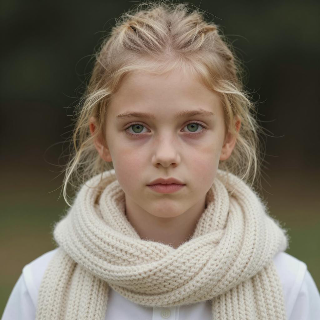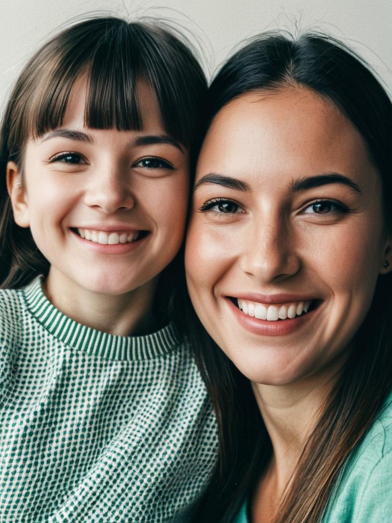Close-up photograph of two people, a woman and a child, lying together. Woman on left with fair skin, light brown hair, brown eyes, slight smile. Child on right with fair skin, blonde hair, blue eyes, slight smile. Background blurred. Woman's head tilted slightly down, child's head tilted up. Light from top left. Both faces close together.