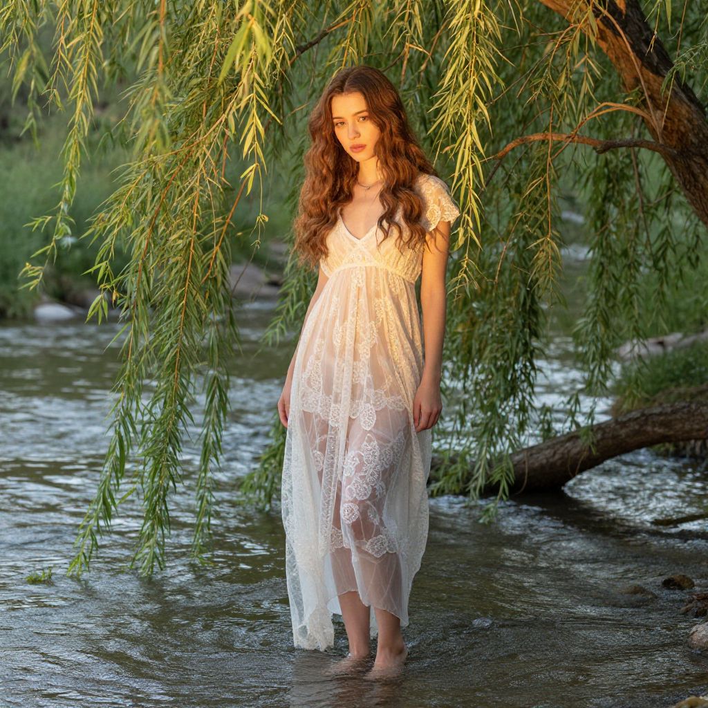 Photograph of a young woman with long, wavy brown hair, wearing a sheer white lace dress, standing in a shallow river under a weeping