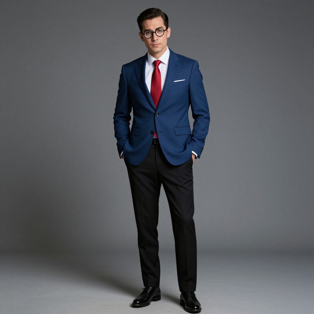 A stylish man in his late 30s, with neatly combed dark hair and wearing distinctive round glasses, is dressed in a sharp blue suit paired with a vibrant red tie and crisp black pants. He stands confidently, with both hands casually tucked into his pockets, exuding an air of suave mystery. Cinematic lighting, full body shot, high detail, photorealistic.