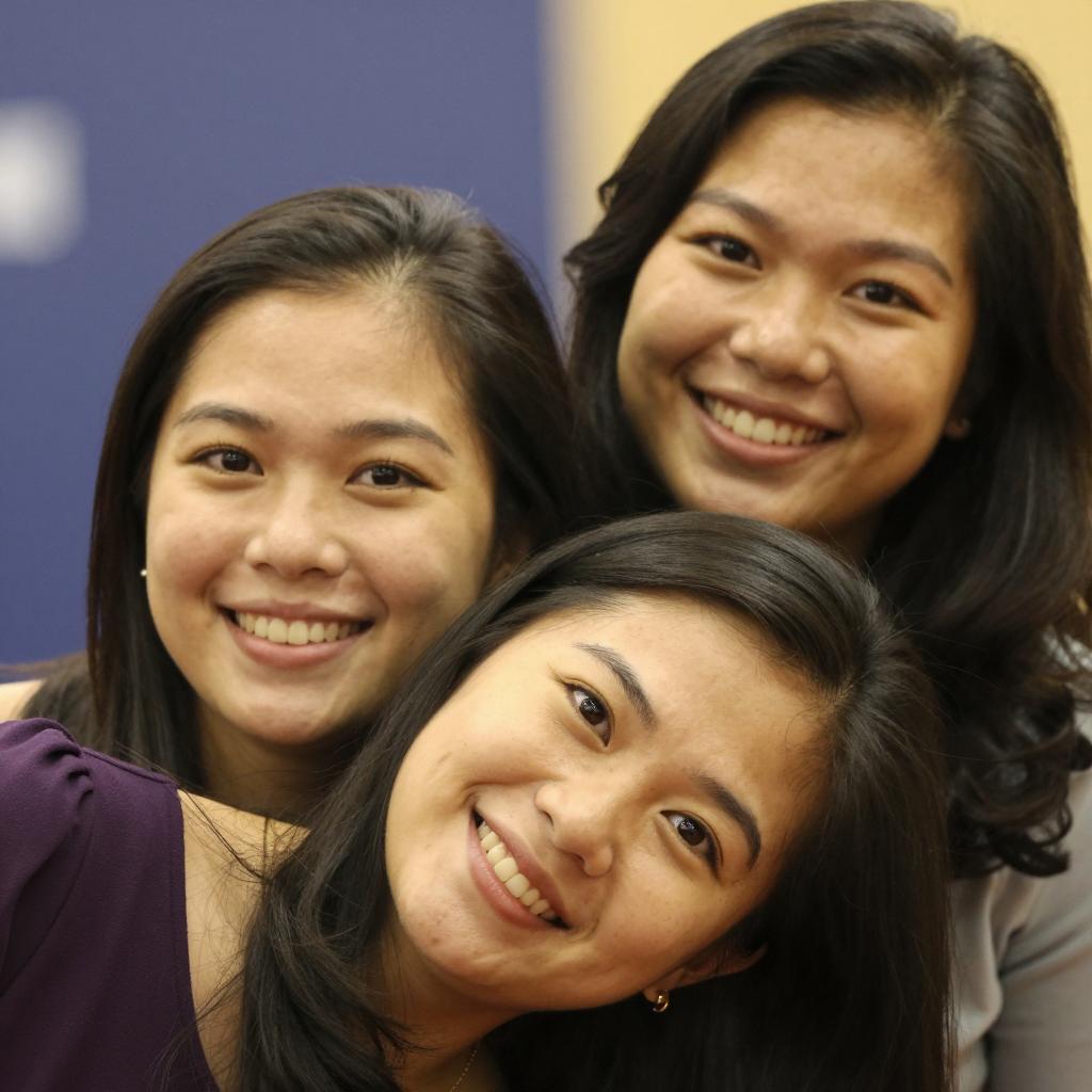 Close-up portrait of three smiling Asian women with dark hair. The woman in the foreground wears a purple top and a gold necklace, leaning slightly forward. The woman in the middle and the one in the background also smile warmly. The background features blurred blue and yellow colors under warm lighting.