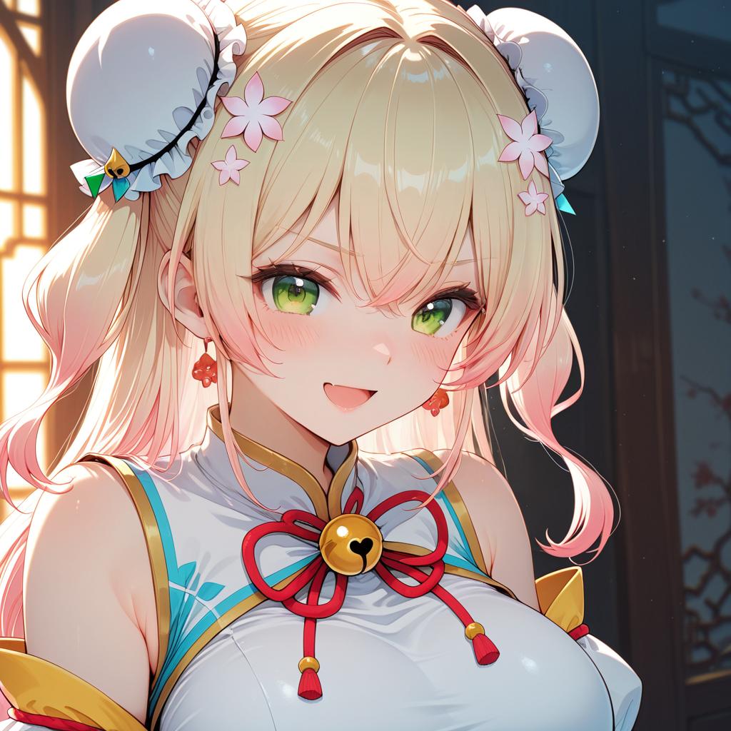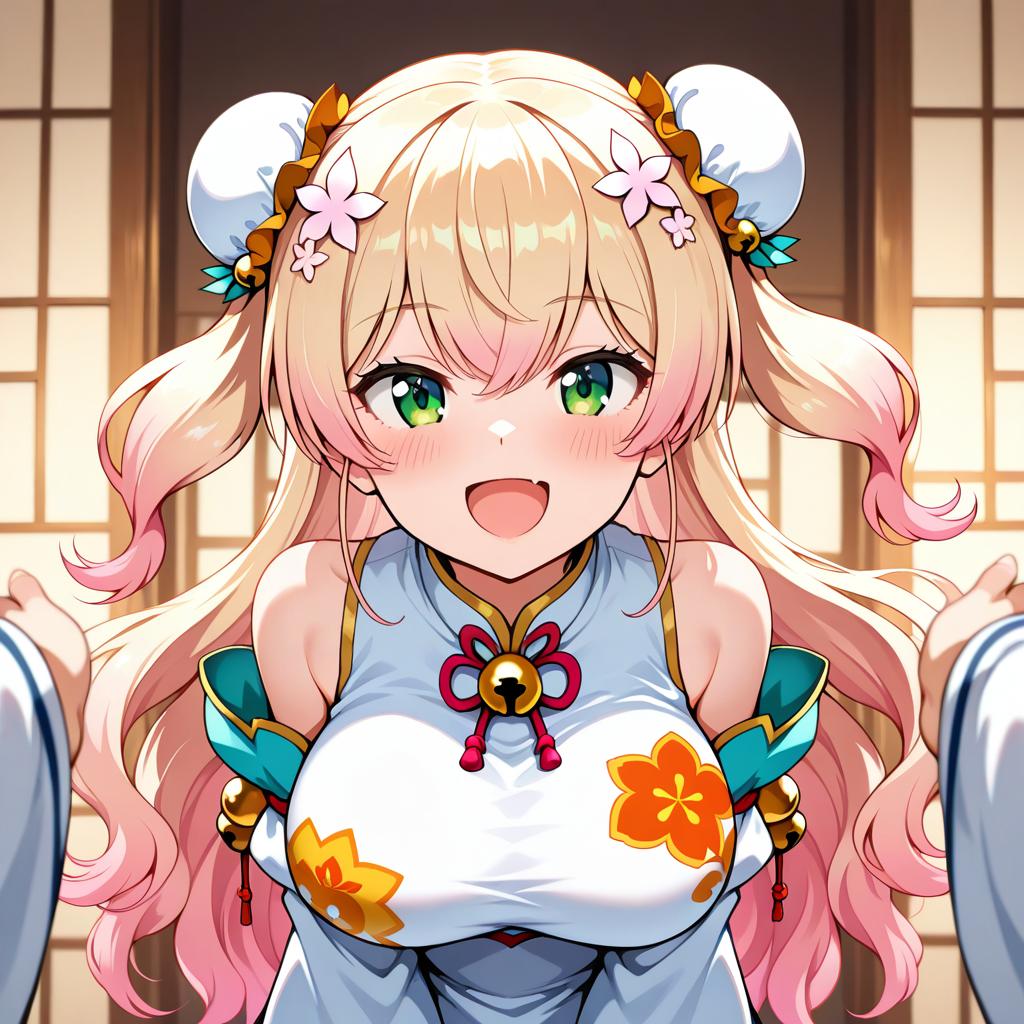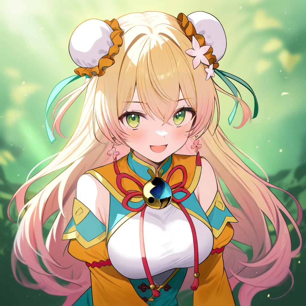 Momosuzu nene (old design), hololive, 1girl, fang, green eyes, hair between eyes, blonde hair, long hair, gradient hair, pink hair, double bun, two side up, hair flower, bun cover, medium breasts, large breasts, chinese clothes, chinese clothes, detached sleeves, juliet sleeves, virtual youtuber, virtual youtuber, jingle bell, by artist wsman, illustrious