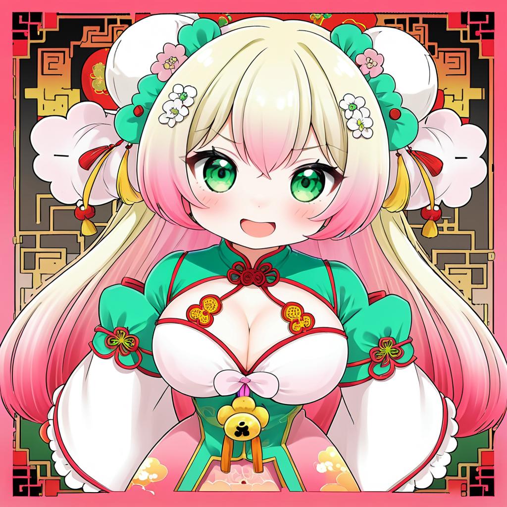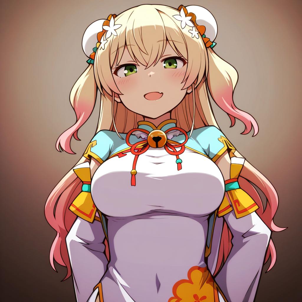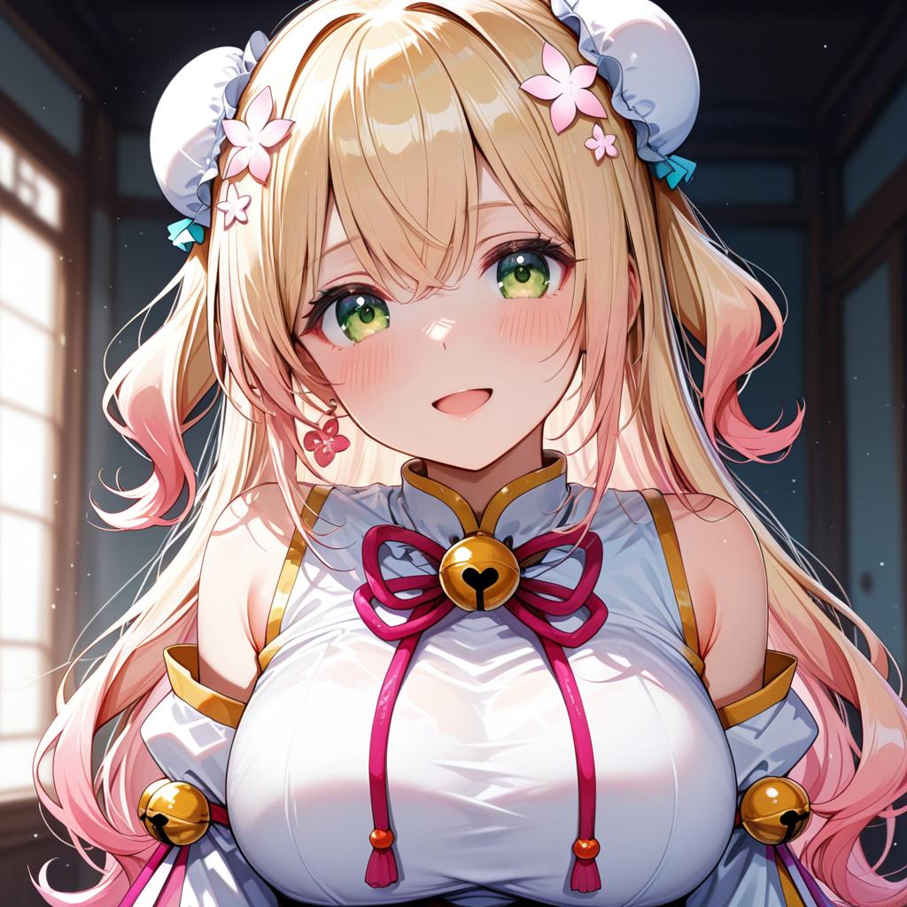 Momosuzu nene (old design), hololive, 1girl, fang, green eyes, hair between eyes, blonde hair, long hair, gradient hair, pink hair, double bun, two side up, hair flower, bun cover, medium breasts, large breasts, chinese clothes, chinese clothes, detached sleeves, juliet sleeves, virtual youtuber, virtual youtuber, jingle bell, by artist wsman, illustrious