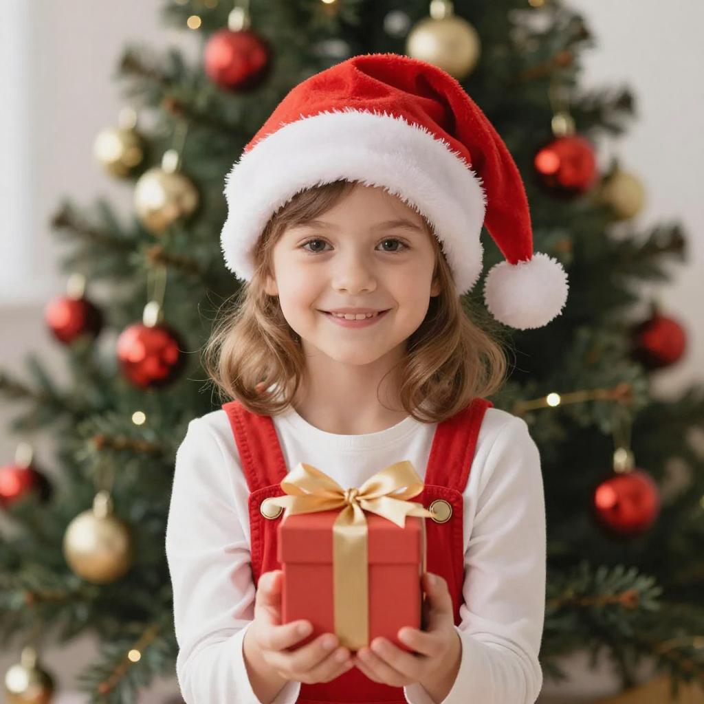 Photograph of a young girl with light brown hair, wearing a red Santa hat and red overalls over a white shirt, smiling at the camera. She's holding a small red gift box with a gold ribbon. The background is a Christmas tree adorned with red and gold ornaments, slightly blurred with a shallow depth of field. The lighting is bright and even, with a front-facing camera angle.